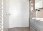 De moderne en keurige badkamer is voorzien van een inloopdouche, wastafelmeubel en toilet.