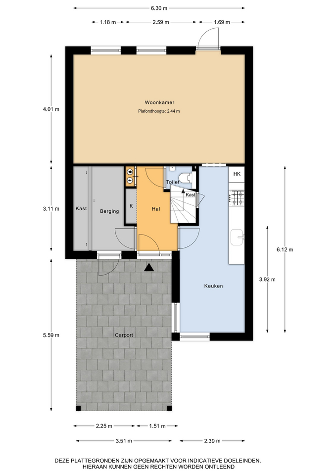 Begane grond: entree/ hal – toegang tot de bijkeuken/ inpandige berging met vaste kast – garderobe – meterkast – toilet – toegang tot de half open keuken – woonkamer.