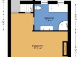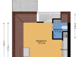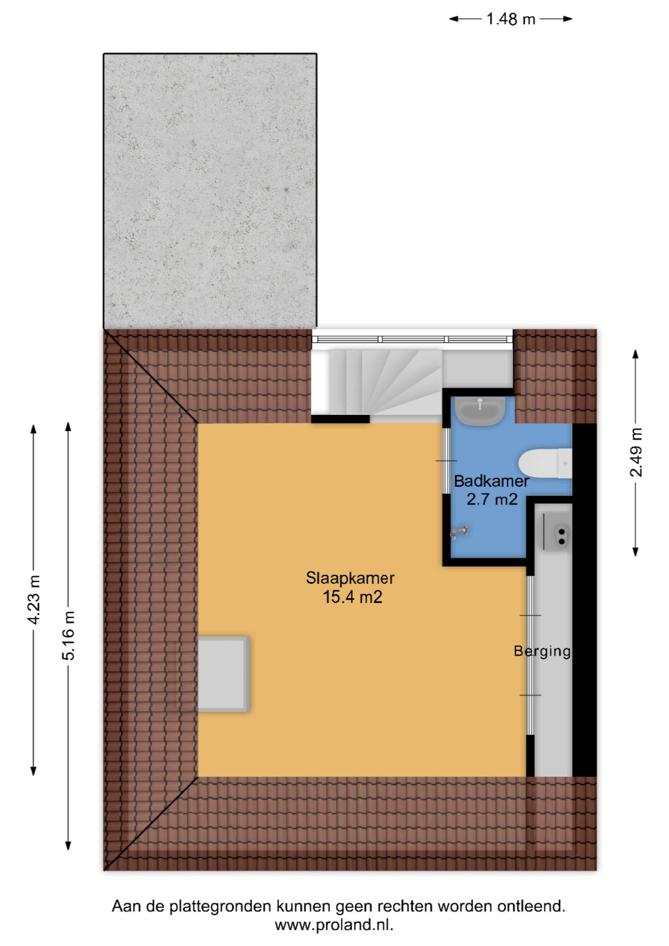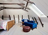 een ruime werk/slaapkamer met toegang tot een klein, maar bijzonder dakterras op het N-W en bergruimte achter de knieschotten.