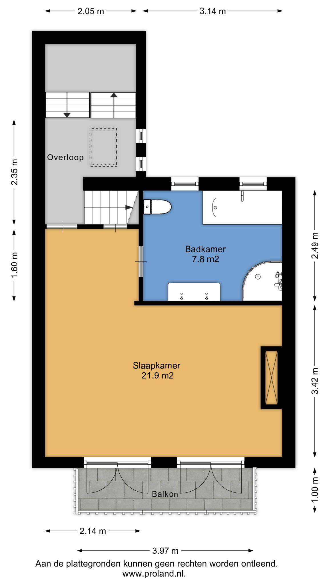 in de hoek bevindt zich een kleine badkamer met douche, toilet en wastafel.