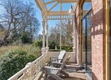De openslaande deuren geven toegang tot de overdekte veranda met prachtig houtsnijwerk en via een bewerkte stalen trap komt u in de tuin.